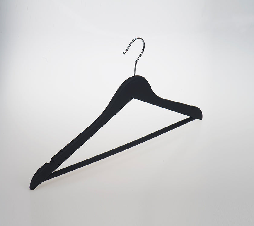 * Black plastic clothes hanger with anti slip notch and trousers bar ,can hanging trousers and prevent clothes slip.