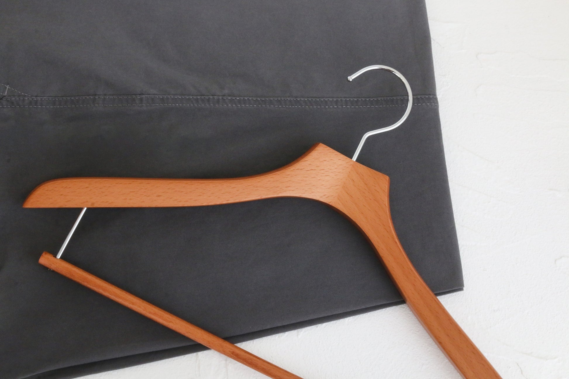 This suit hanger is made of natural solid wood with smooth finish. No irregularities or flaking off of the finish.